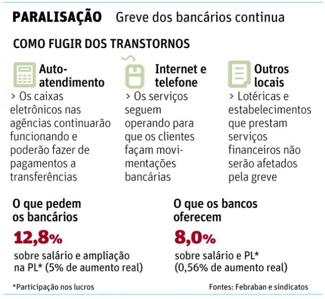 Em São Paulo, 28.600 bancários não trabalharam, de acordo com o sindicato local. Isso representou 21% de um total de 135 mil empregados.